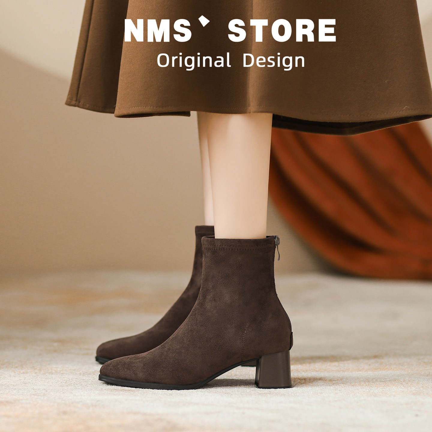 爆款超火绒面粗跟高跟鞋小短靴女2025秋冬款切尔西5cm瘦瘦靴加绒