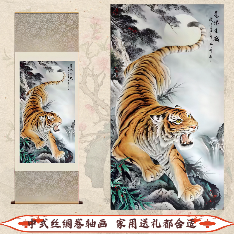 国画老虎画装饰无框下山虎卷轴画风水画客厅玄关竖幅挂画虎虎生威