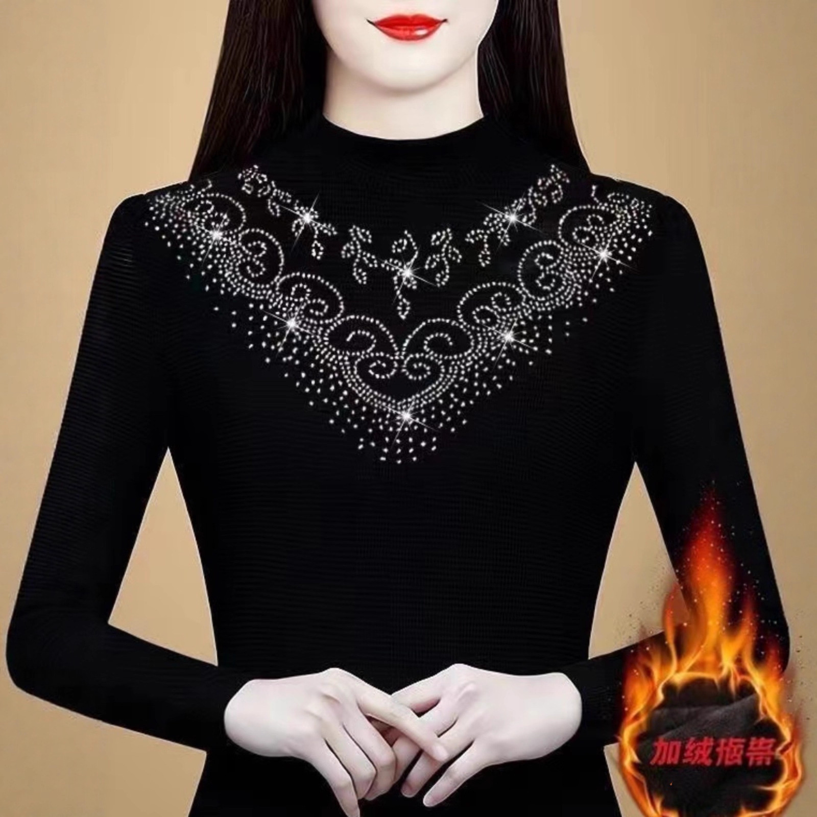 半高领网纱烫钻印花小衫长袖t恤女内搭2025秋冬季修身百搭蕾丝衫