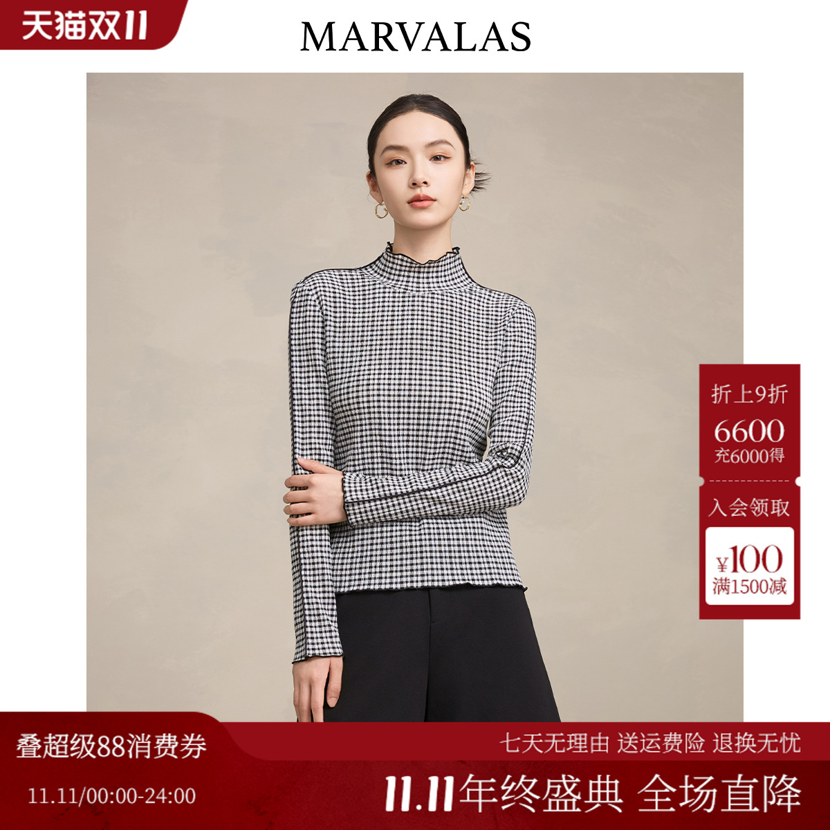 曼德诗高领打底衫2025年秋季新款格纹雪纺衫轻薄百搭蕾丝衫小上衣