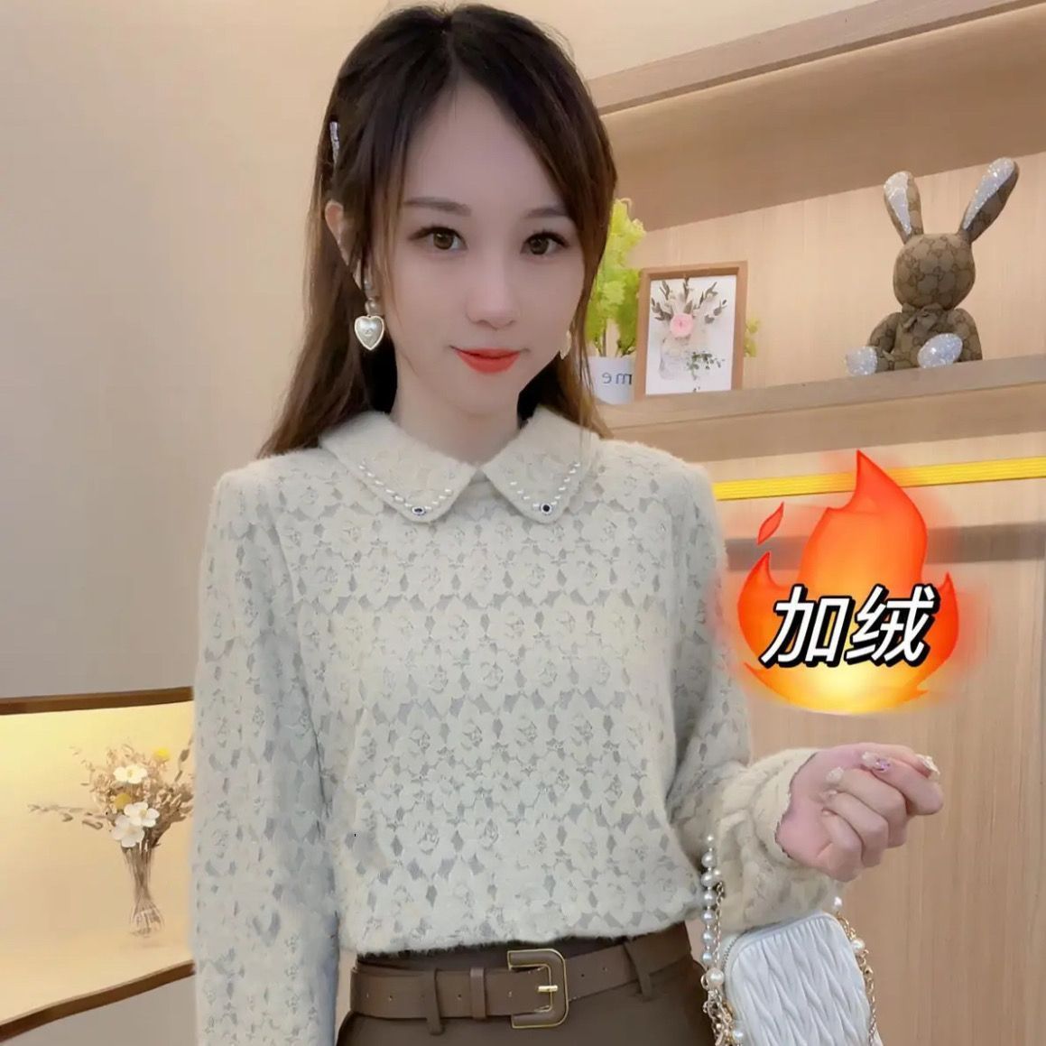 加绒加厚秋冬新款打底衫女时尚洋气小衫百搭蕾丝衫长袖娃娃领衬衫