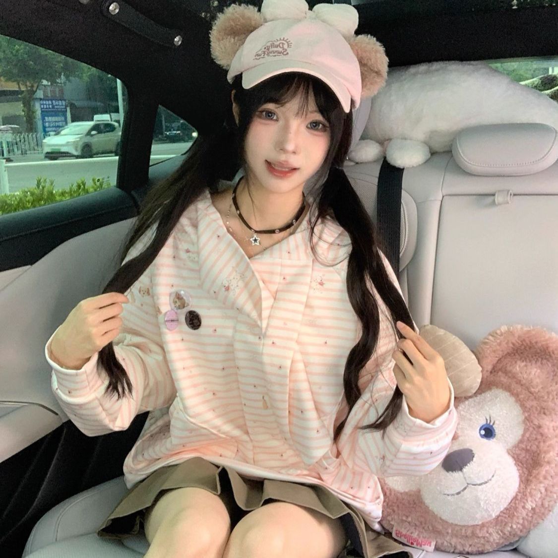 韩系学院风绑带条纹小狗连帽卫衣运动衫女秋冬宽松设计感上衣外套