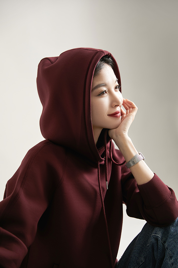 邑品酒红色休闲时髦 Q弹软糯空气层气质连帽卫衣女柔软亲肤高级感