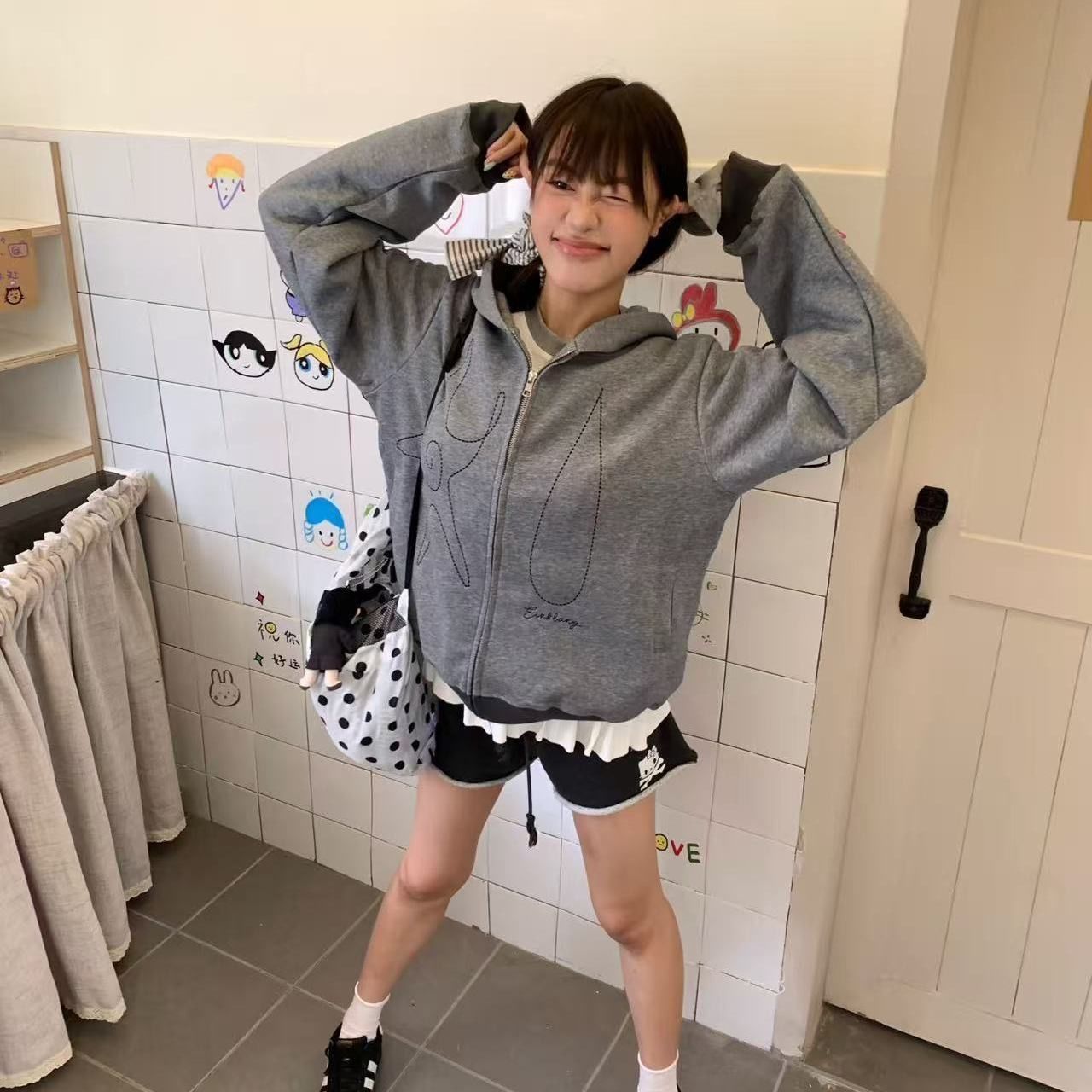 灰色连帽卫衣外套女秋季新款简约小个子修身长袖双拉链开衫上衣潮