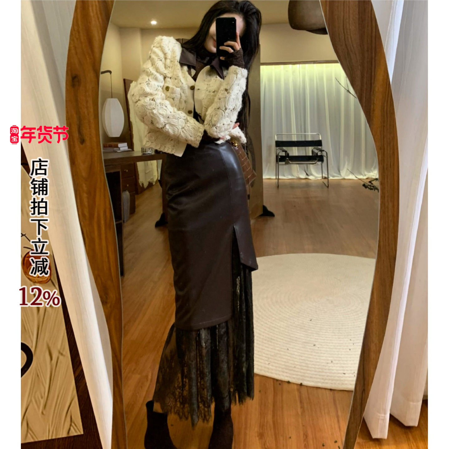 利达NEWDADADA法式设计感不规则蕾丝花边半身裙女中长皮裙子TQ738