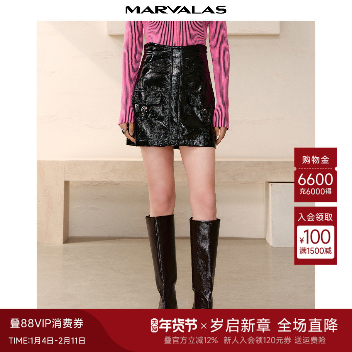曼德诗高腰短裙2025秋季新款摩登复古亮面PU皮裙子气质百搭半身裙