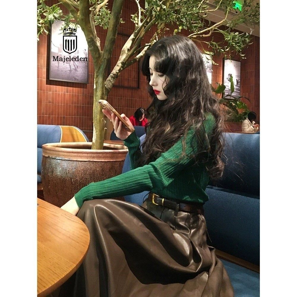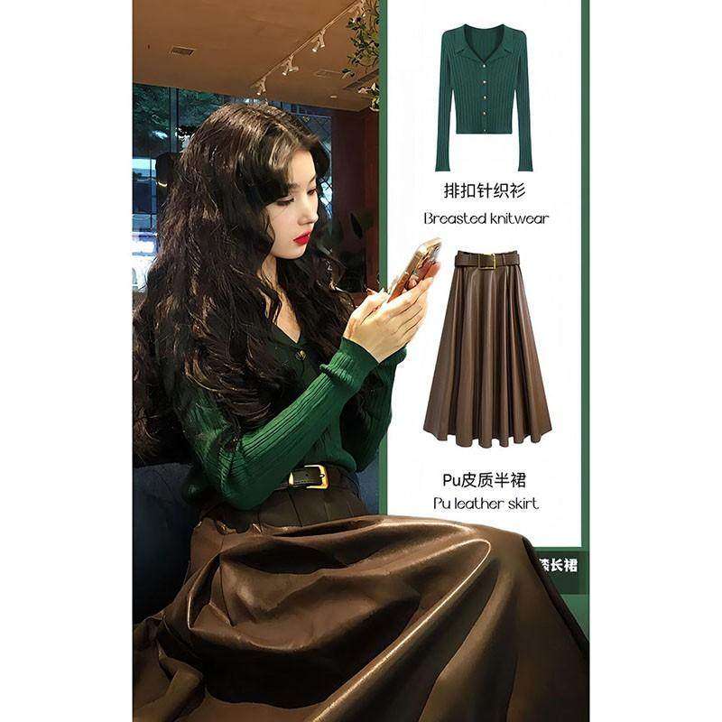 秋冬搭配一整套韩系小香风套装高级感时尚绿色针织衫皮裙子两件套