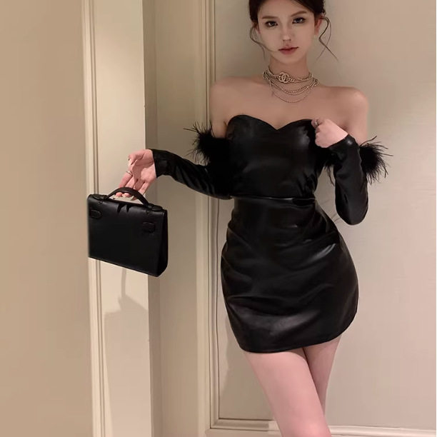1235夜店桑拿御姐风气质长袖抹胸连衣裙女春秋季辣妹PU皮裙子