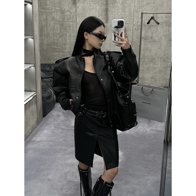 Fanptntox 半身裙女秋季新款前开叉皮裙子修身显瘦包臀裙时尚中裙