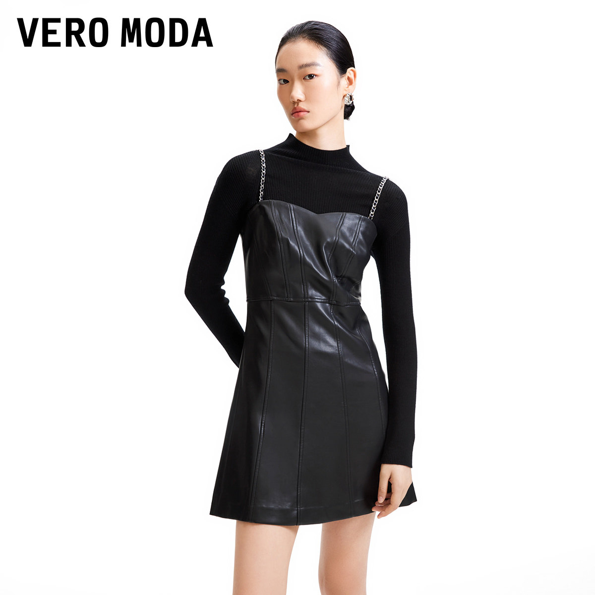Vero Moda奥莱连衣裙秋季新款黑色PU收腰吊带A摆时髦显瘦皮裙子