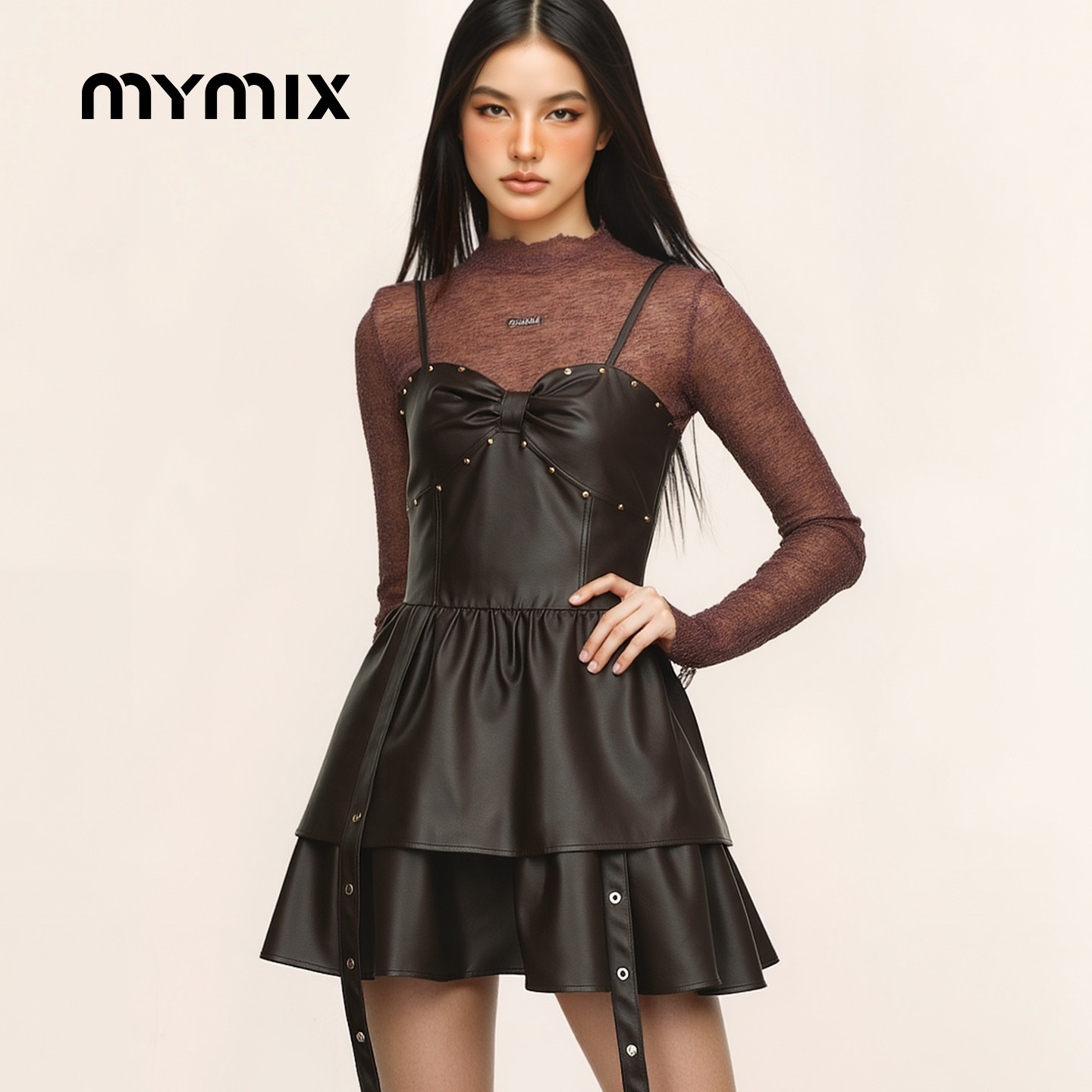 【25冬新品】MYMIX复古辣妹风吊带铆钉连衣裙女显瘦短款皮裙子