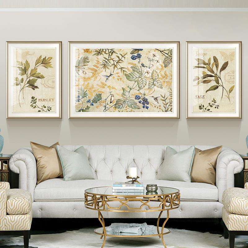 简约美式客厅画沙发背景画美式轻奢装饰画简约抽象花卉三联花鸟画