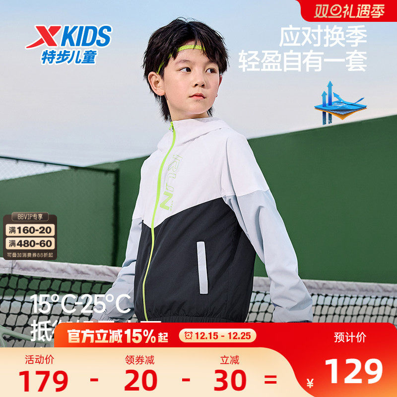 特步童装儿童外套冬季款男薄款运动风衣2025新款男童网布连帽上衣