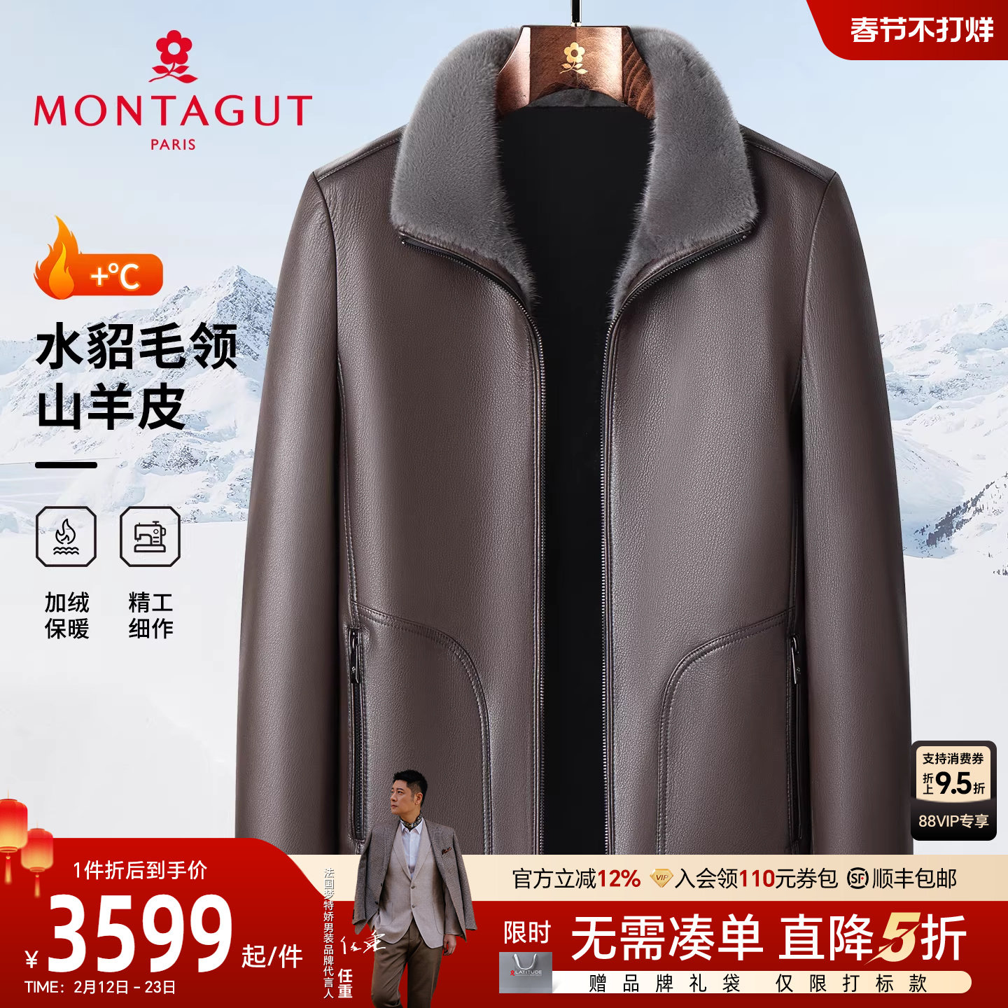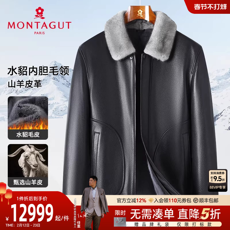 [山羊皮/水貂毛领]梦特娇男士真皮皮衣冬季商务夹克加绒外套保暖J