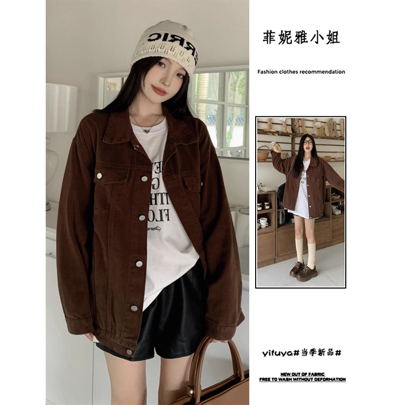 美式复古深棕色磨毛牛仔外套女初秋美拉德小个子工装休闲上衣夹克