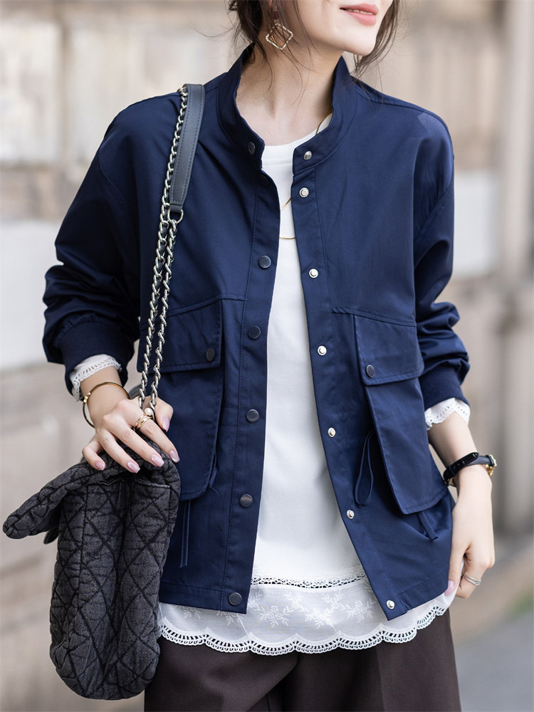 法式深蓝色工装风衣外套女初秋新款文艺覆古休闲宽松立领夹克上衣