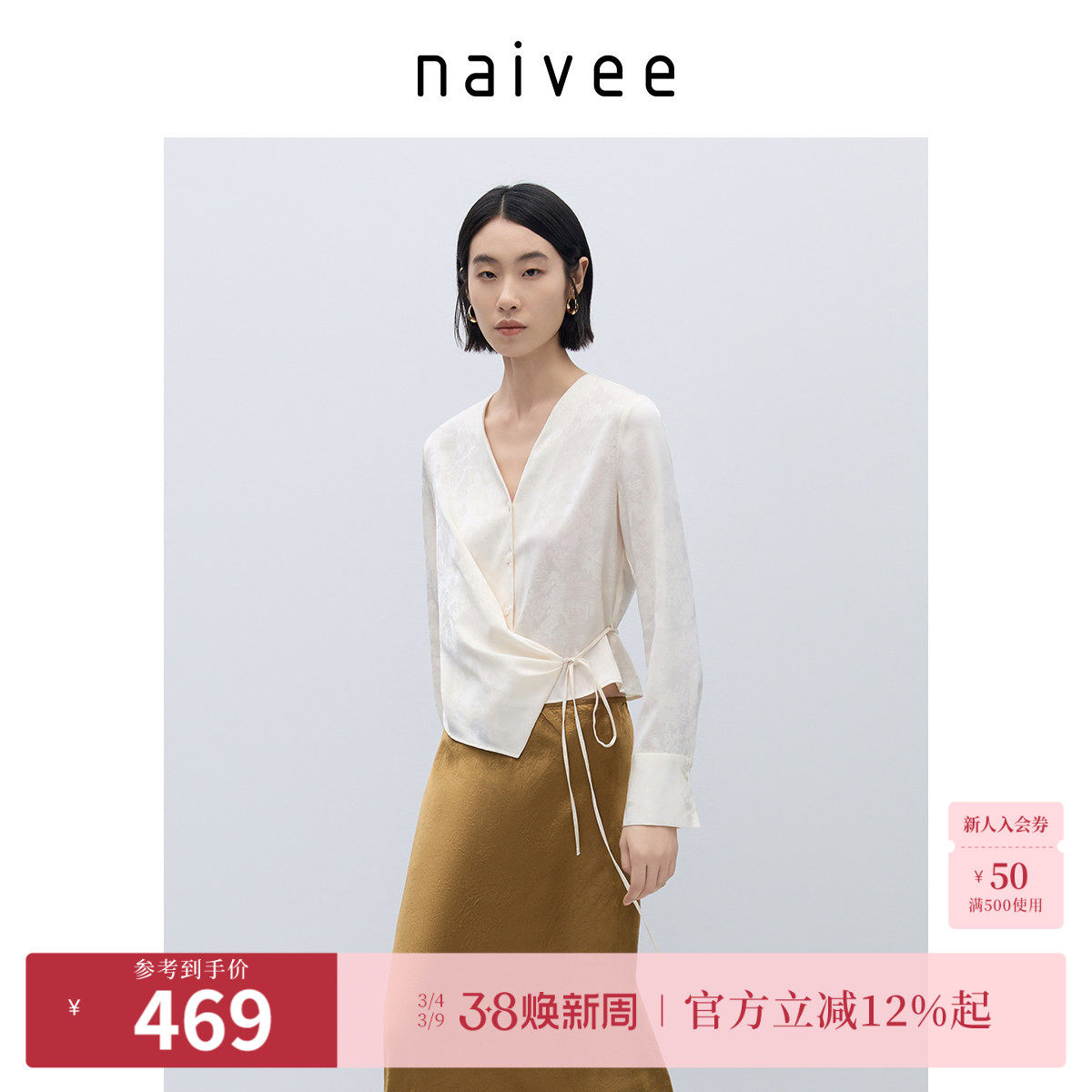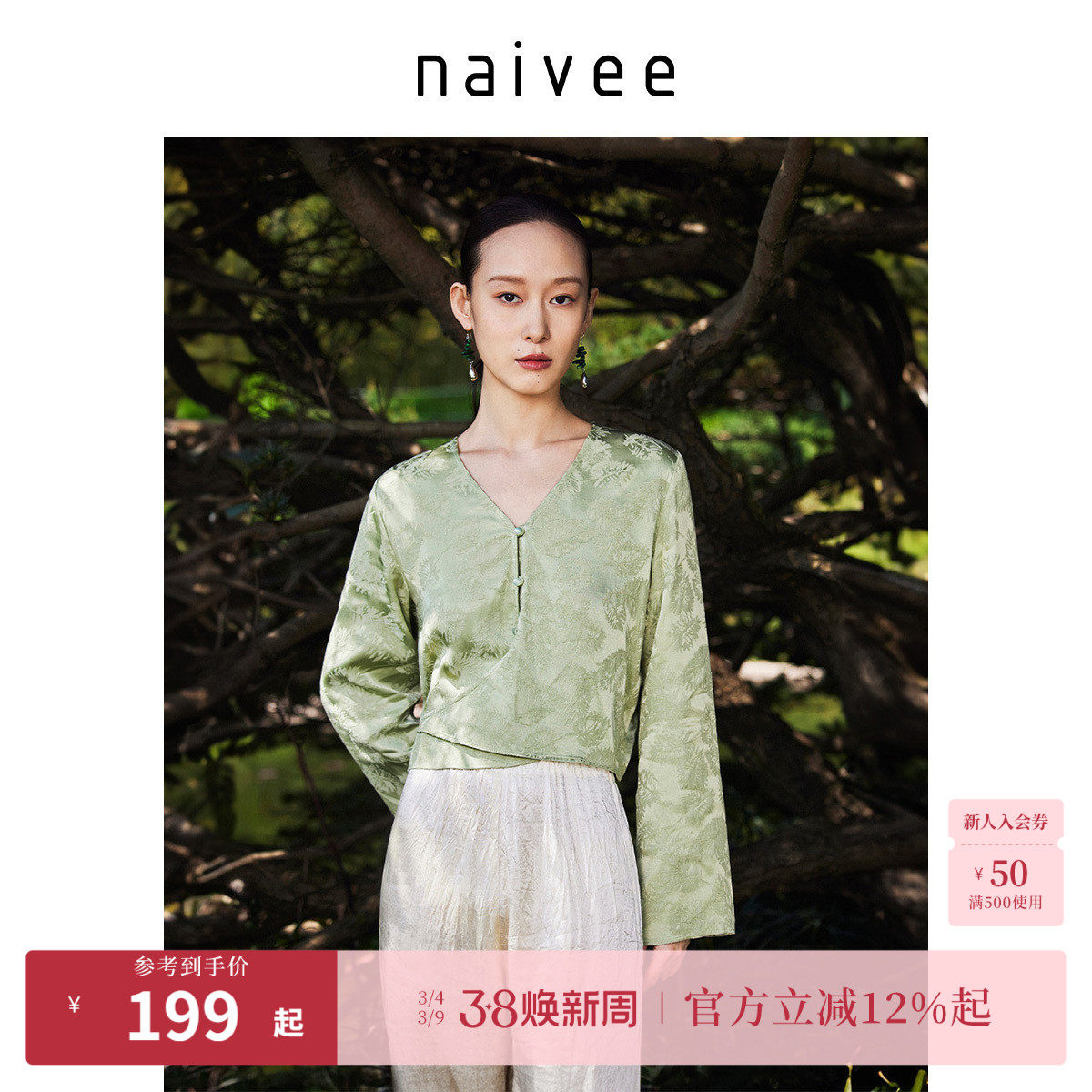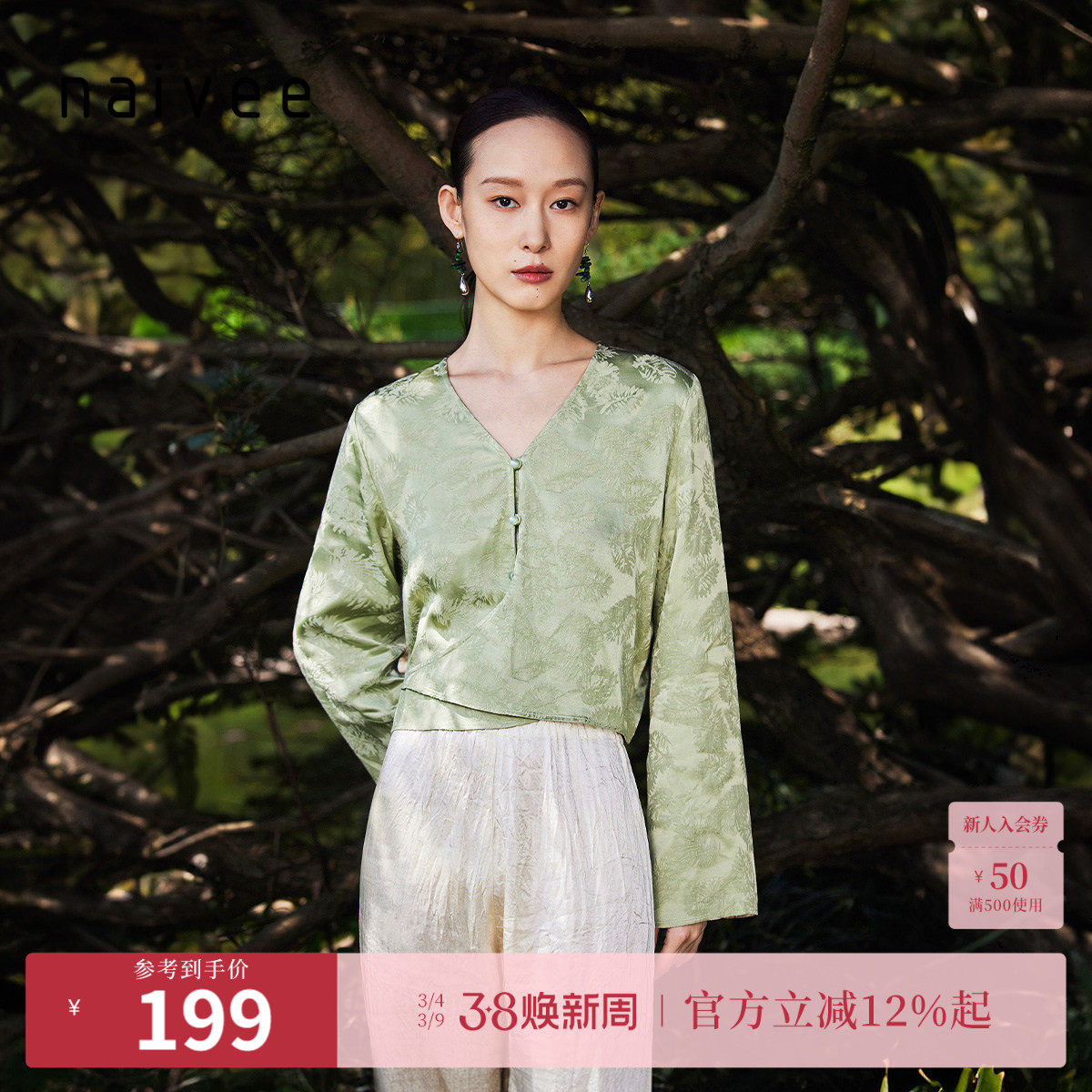 naivee纳薇25秋新中式女装V领收腰衬衫女缎面提花醋酸长袖上衣
