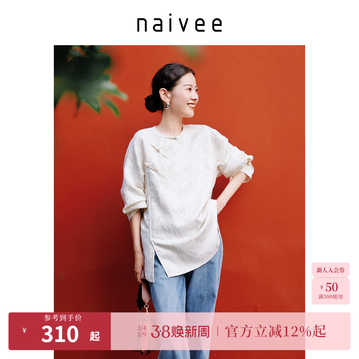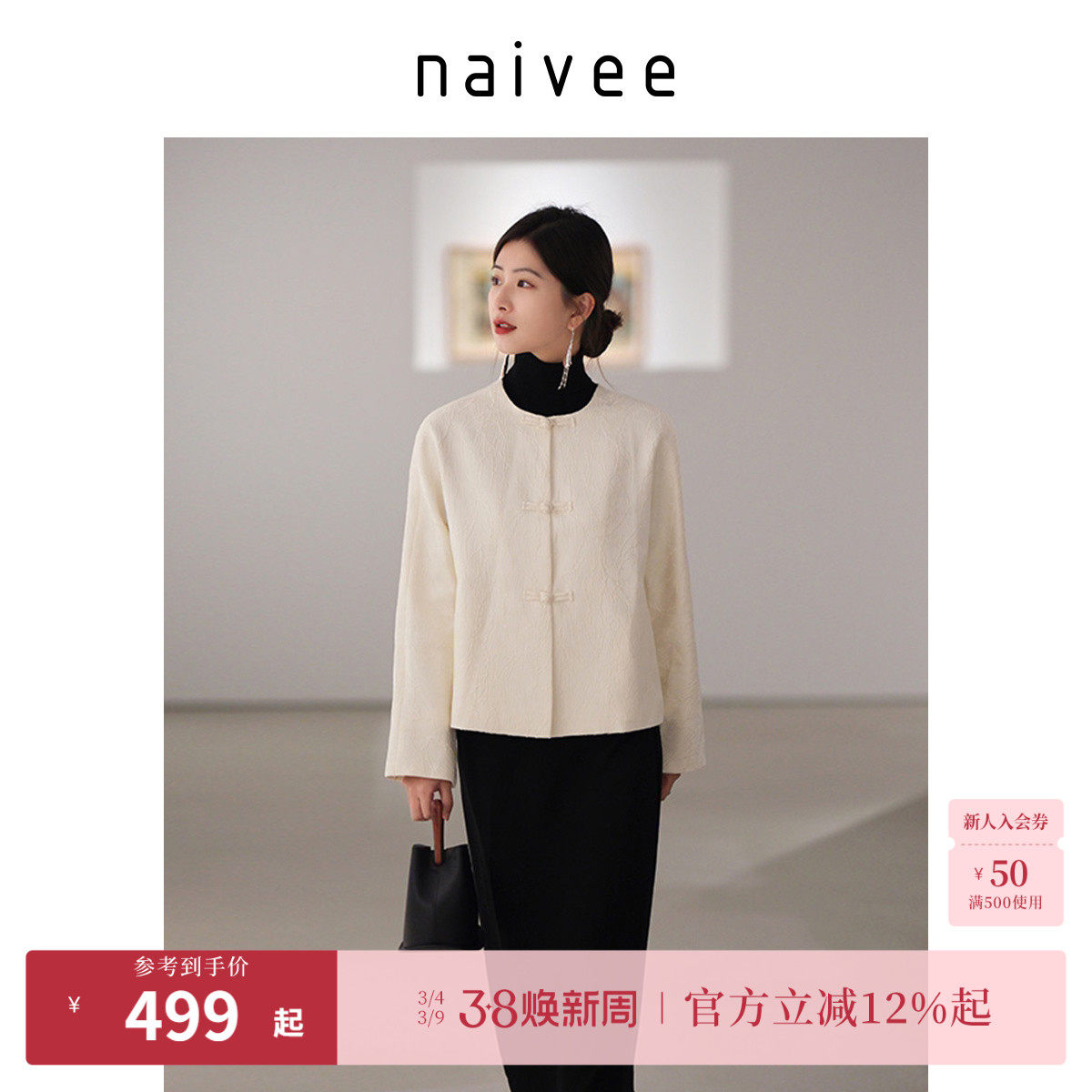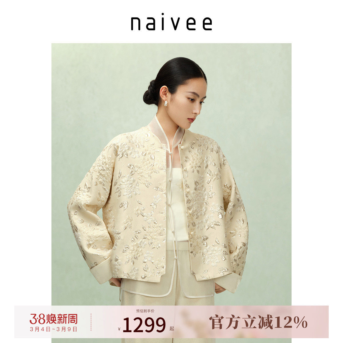 naivee纳薇新中式秋女装气质宽松国风上衣对襟提花白色短外套女