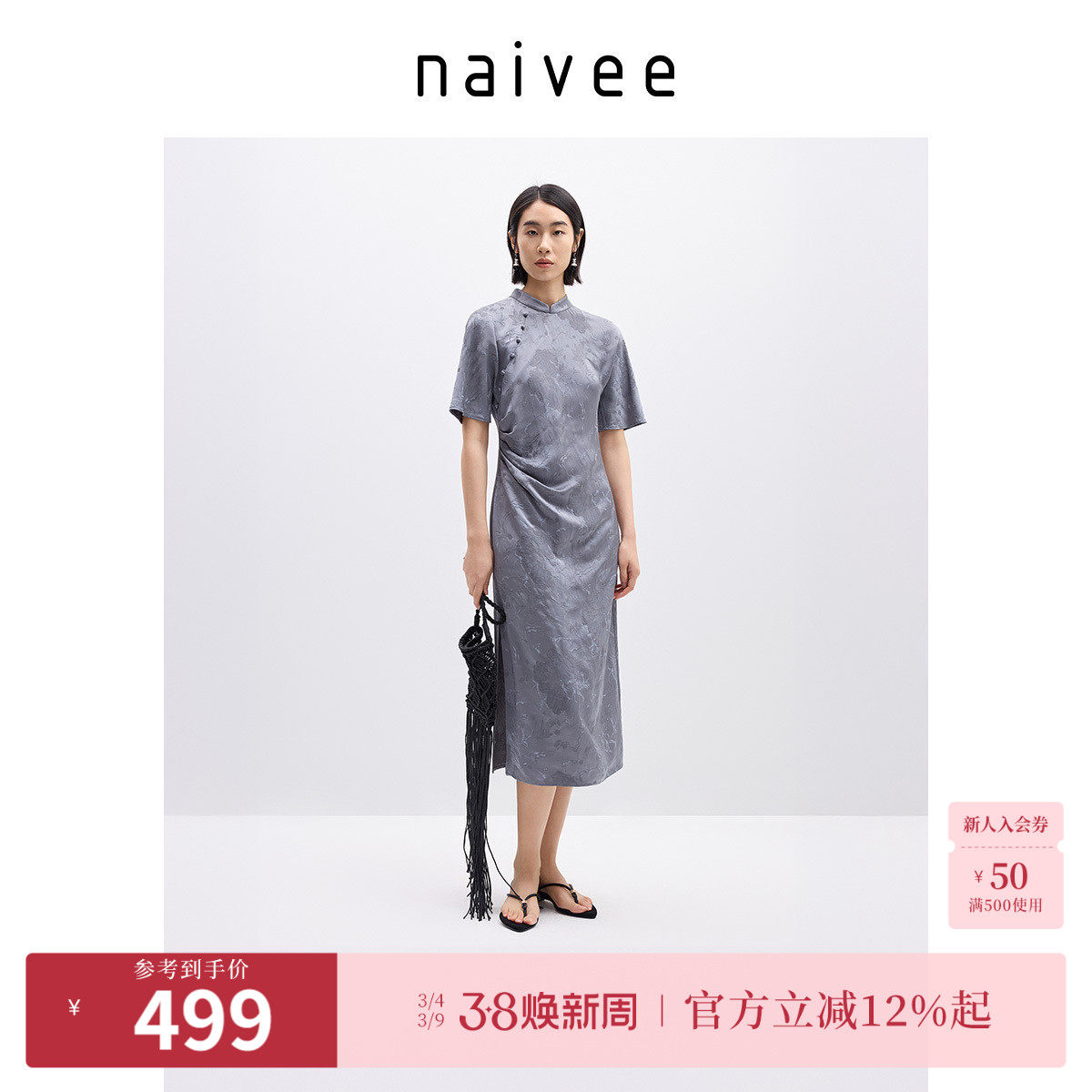 naivee纳薇新中式国风女装2025夏薄款人丝提花收腰改良旗袍连衣裙