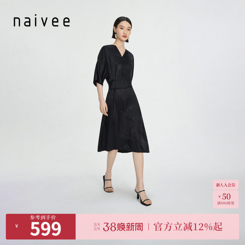 naivee纳薇新中式女装V领宽松真丝连衣裙桑蚕丝提花赴宴轻礼服女