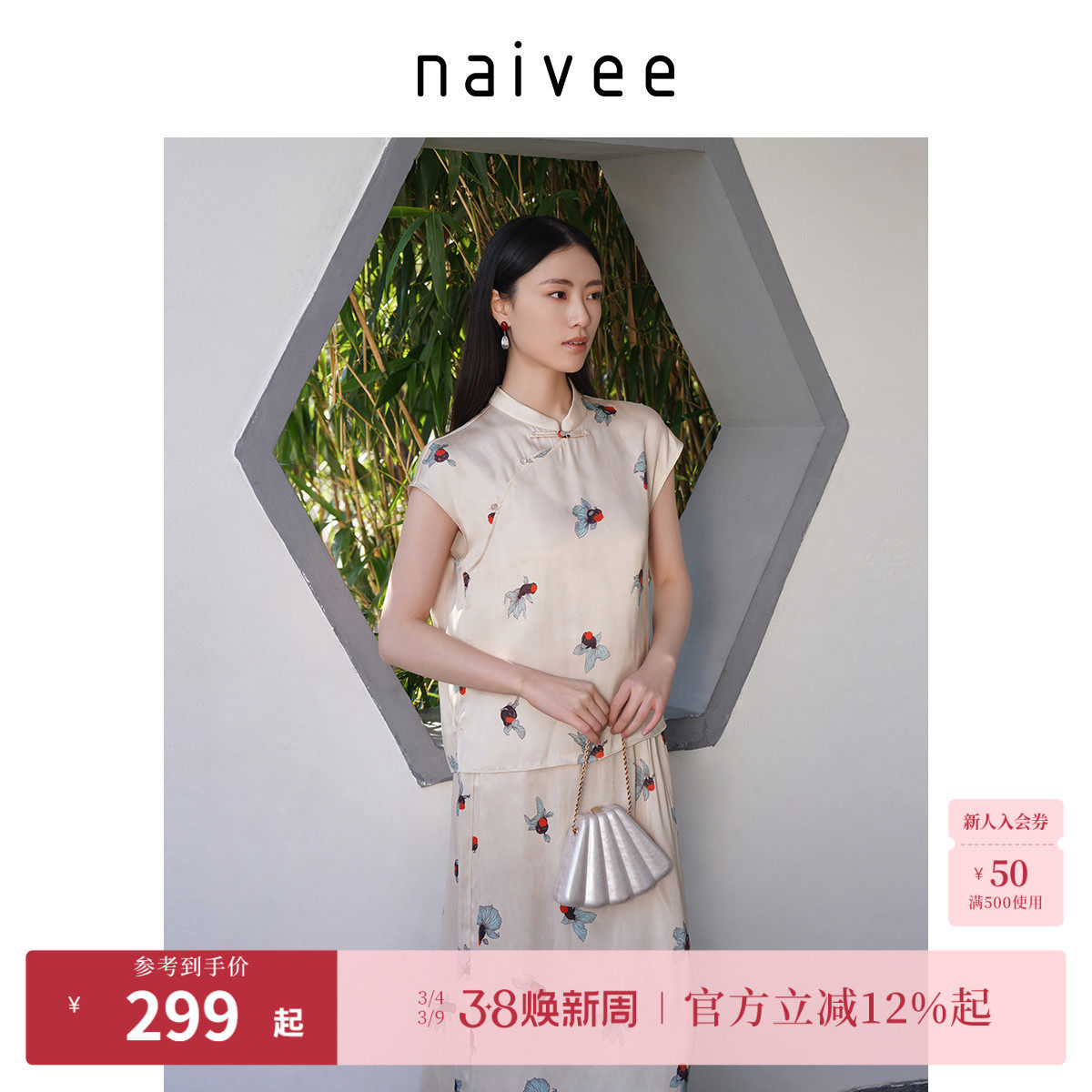 naivee纳薇夏款收腰显瘦新中式女装无袖立领短袖衬衫醋酸上衣