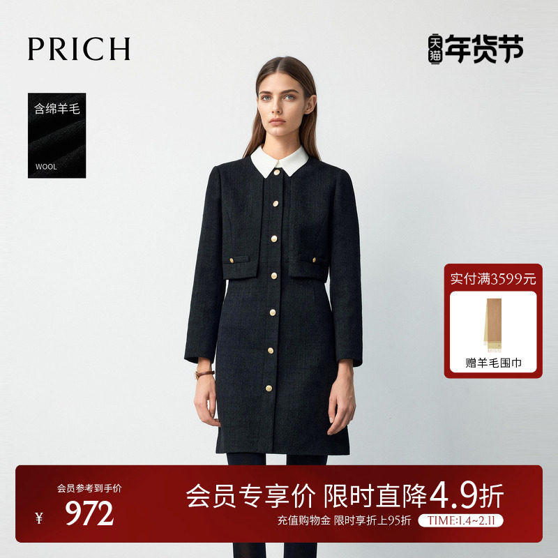 PRICH时尚绵羊毛小香风撞色翻领假两件连衣裙2025冬季新款裙子女
