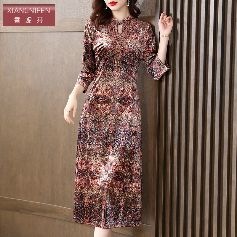 香妮芬时尚连衣裙女2025新款秋季高端气质长袖奢华精致复古妈妈装