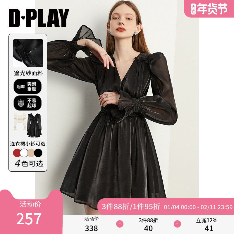 DPLAY2025秋季法式时尚连衣裙气质黑色连衣裙鎏光纱短裙礼服女