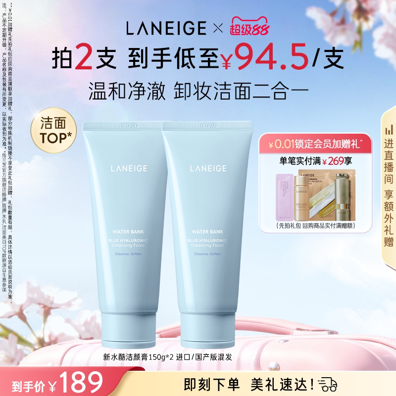 兰芝洗面奶中样新水酷透明质酸嘭润洁颜膏卸妆清洁二合一洁面正品