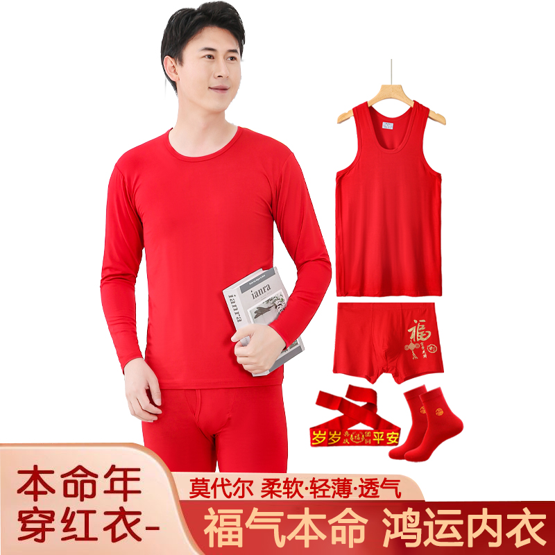大红色秋衣秋裤男士莫代尔内衣套装红背心内裤薄款本命年打底男装