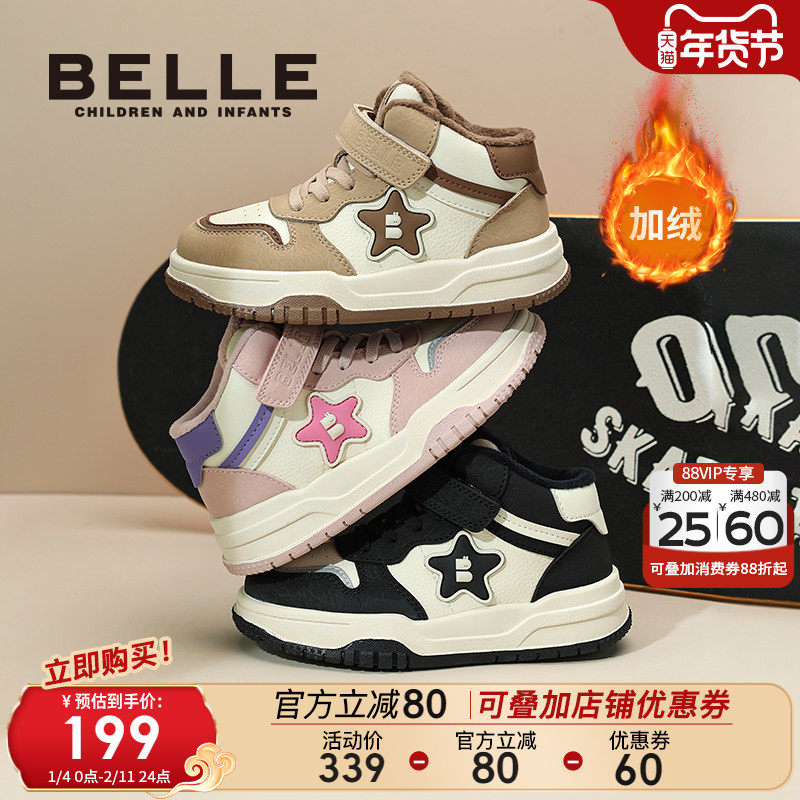百丽童鞋女童加绒运动鞋2025冬季新款儿童高帮板鞋男童保暖休闲鞋
