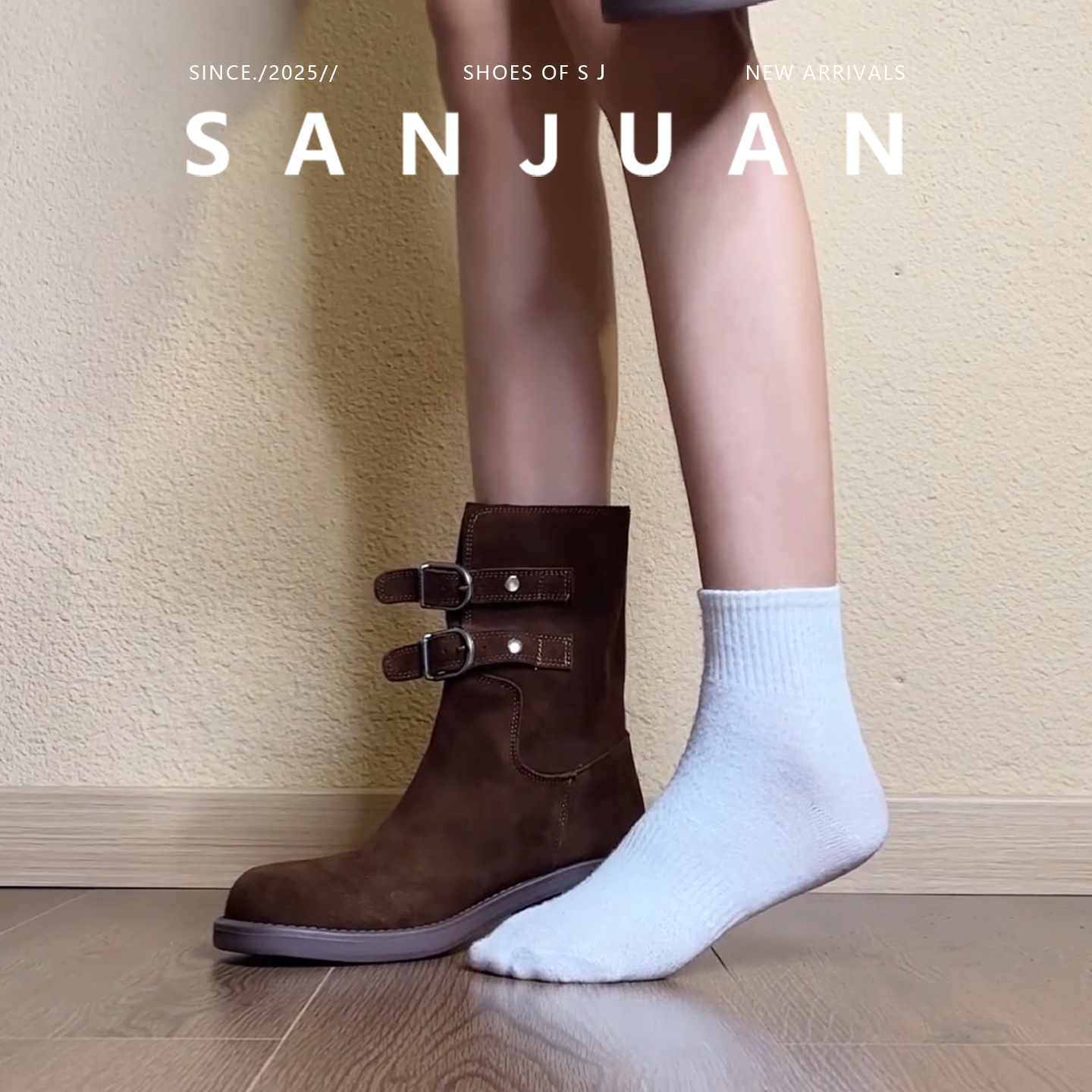 羊皮版sanjuan三卷新款复古厚底短筒粗跟马丁靴女英伦风短靴骑士