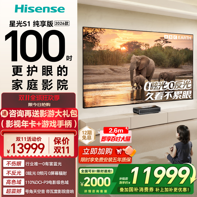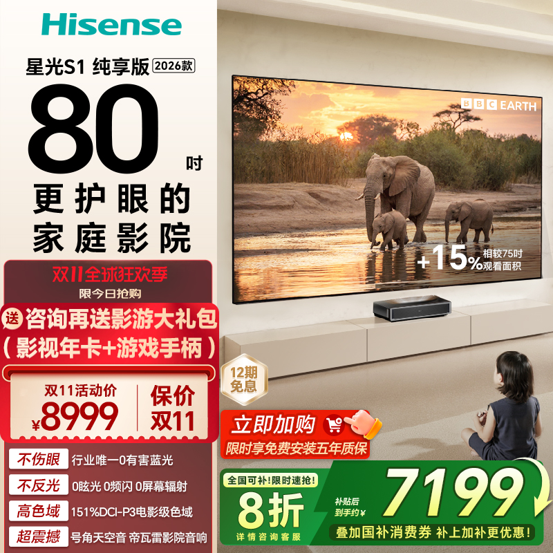 海信激光电视 星光S1 纯享版26款新品 80英寸 大屏护眼换新全国补