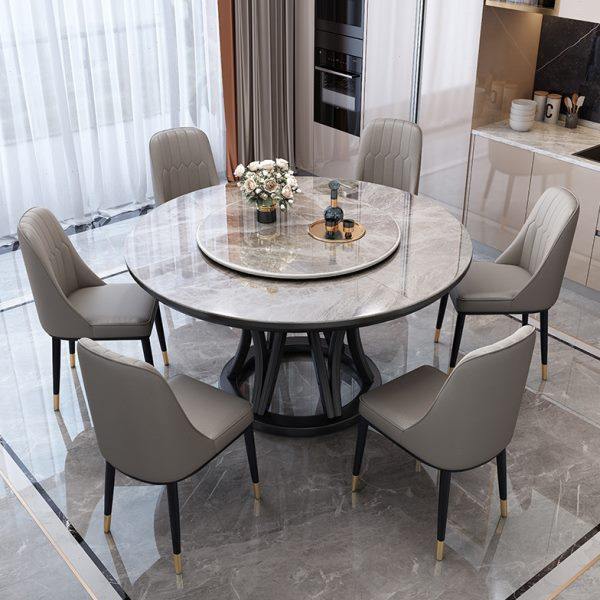 轻奢大理石餐桌椅组合 简约现代岩板圆桌带转盘家用实木圆形饭桌