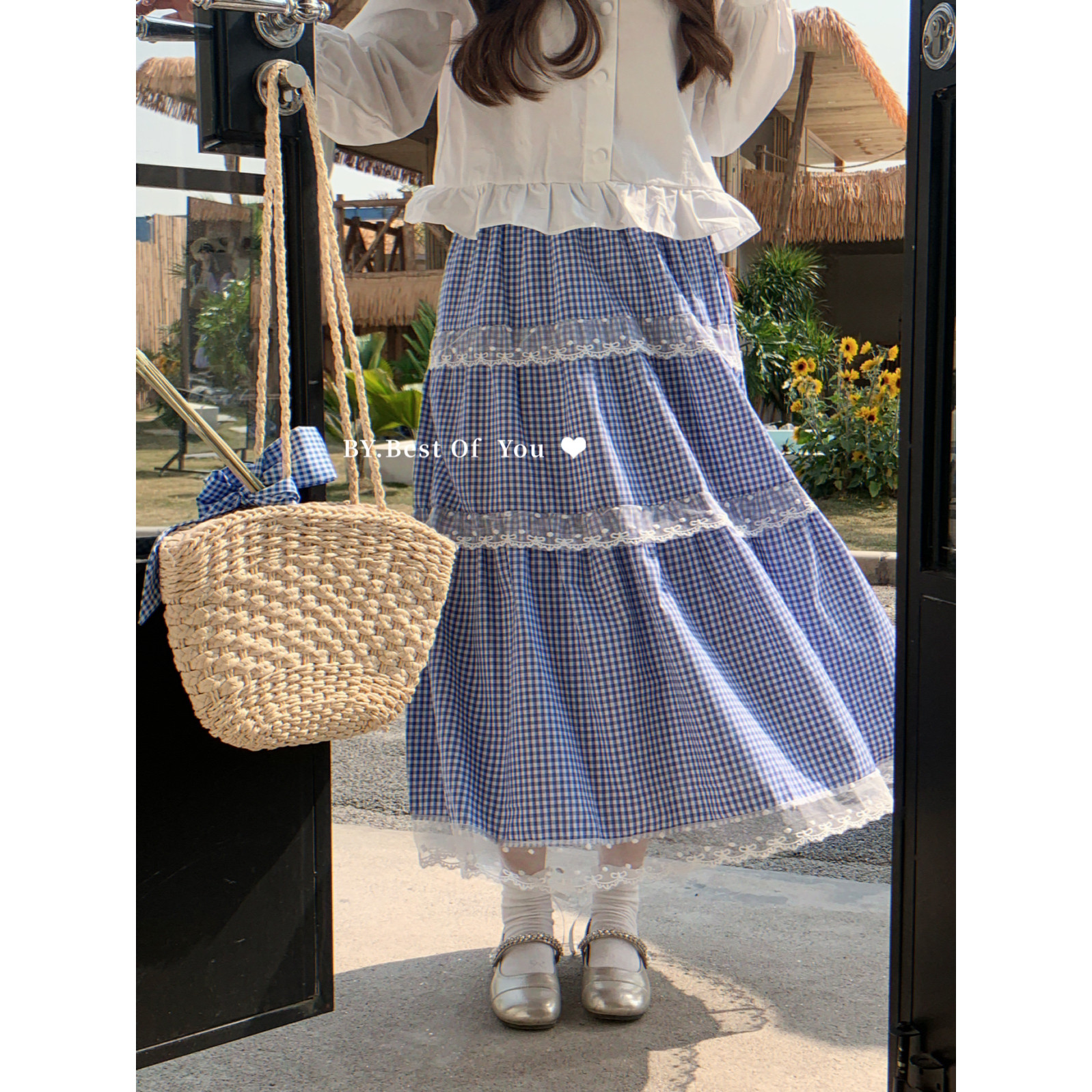 PSO Brand女装复古蕾丝休闲显瘦格子半身裙中长款A字长裙棕色裙子