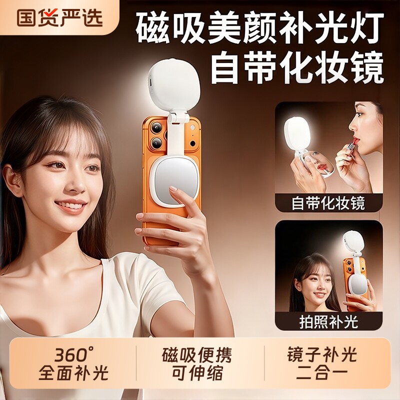 手机磁吸补光灯拍照神器迷你便携式伸缩带镜补光灯自拍补妆口袋镜子旅游拍摄专用手持美颜打光灯主播直播摄影