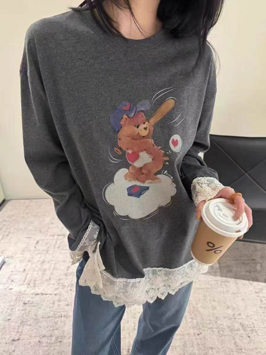 蕾丝拼接长袖t恤女2025秋季新款爆款大码胖mm宽松洋气女士打底衫