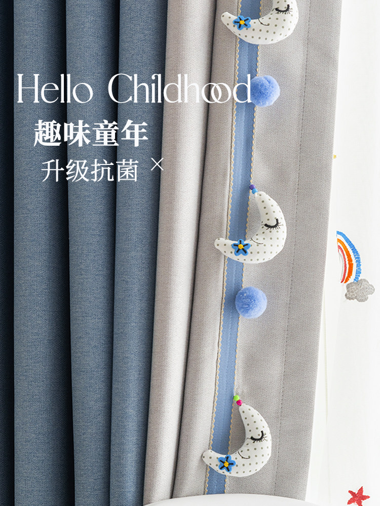 蓝色地中海男孩卧室房间飘窗棉麻儿童房窗帘遮光布定制2022年新款