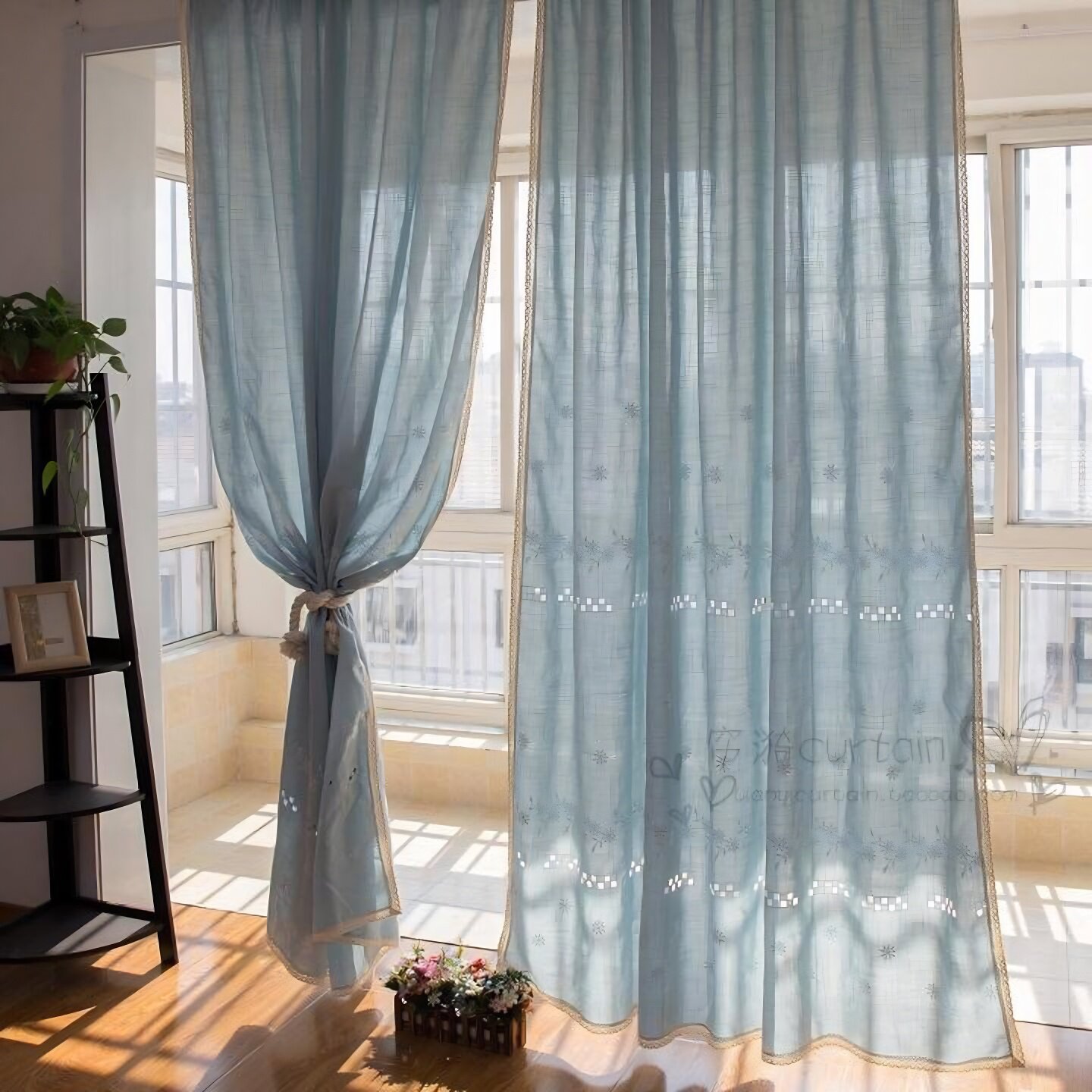 蓝色地中海美式田园成品窗帘 复古外贸刺绣客厅卧室阳台飘窗窗帘