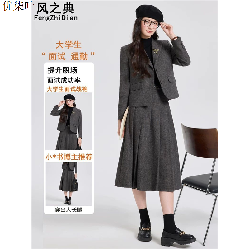 羊毛西装外套女秋冬小个子大学生面试正装穿搭毛呢西服百褶裙套装