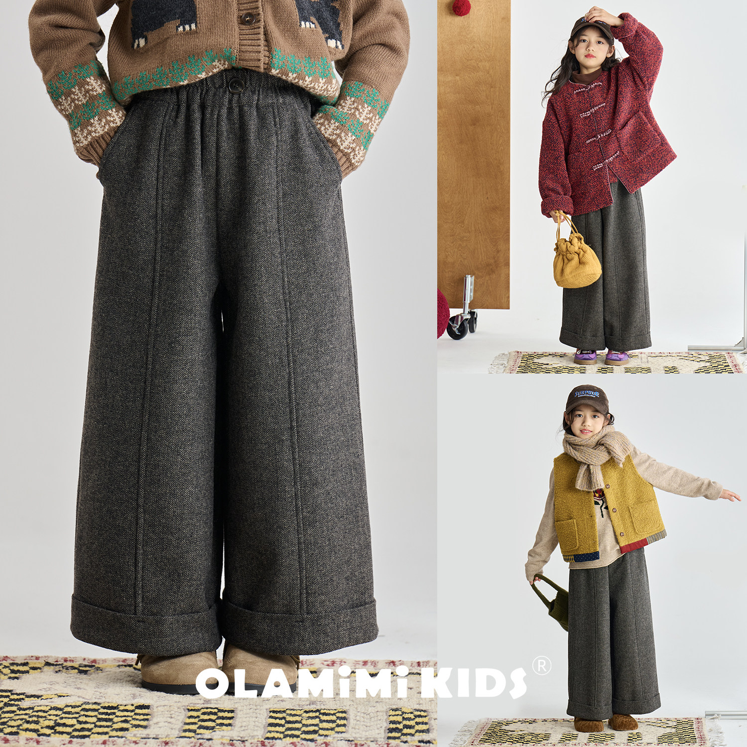 OLAMIMI儿童亲子2025冬日系咖灰人字纹毛呢阔腿九分裤加绒休闲裤