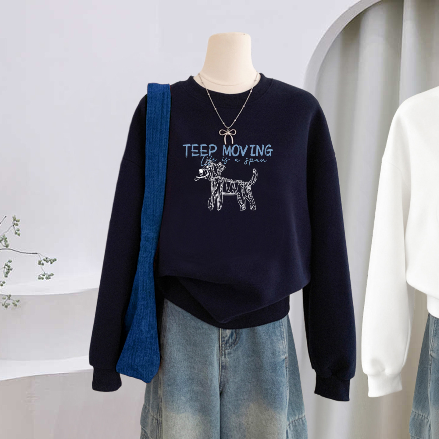 韩版小狗藏青色圆领加绒卫衣女秋冬2025新款宽松显瘦上衣学生外套