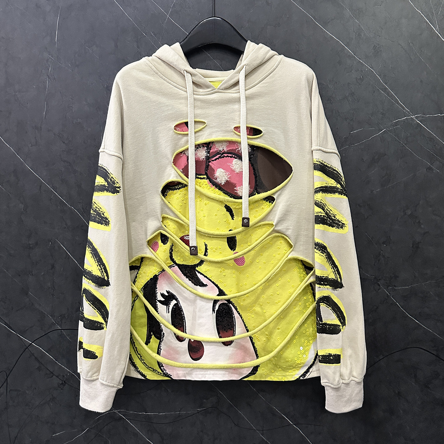 2025秋冬重工新款卡通小女孩破洞假两件连帽卫衣女宽松休闲风上衣