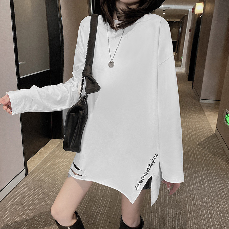 春秋装长袖上衣女宽松中长款纯棉白色下摆破洞t恤卫衣内搭打底衫Y