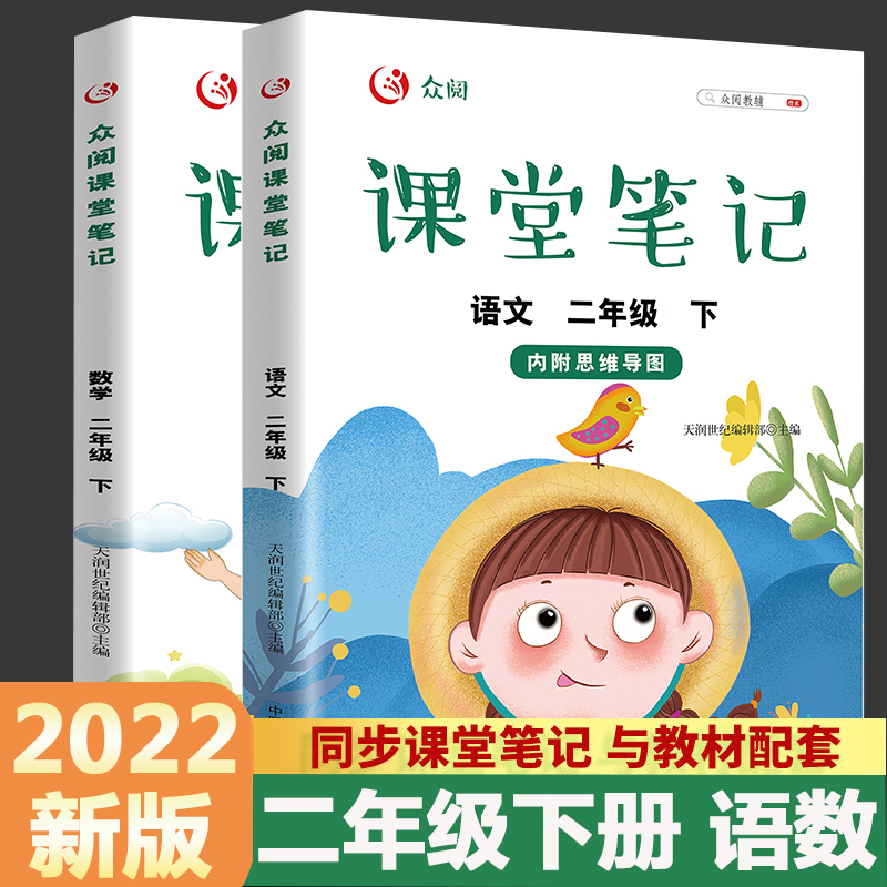 众阅课堂笔记语文+数学二年级下册人教版小学生2年级下学霸课堂同步训练练习册课前预习单课后复习辅导资料书课时作业本