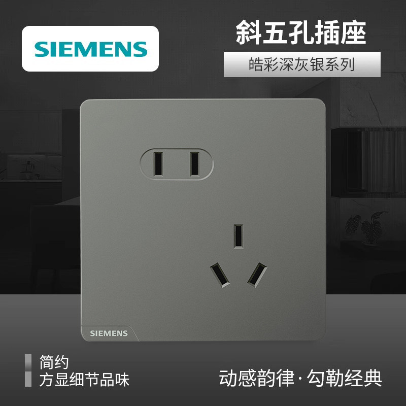 西门子错位五孔插座面板 皓彩深灰银色86型家用电源墙壁开关插座