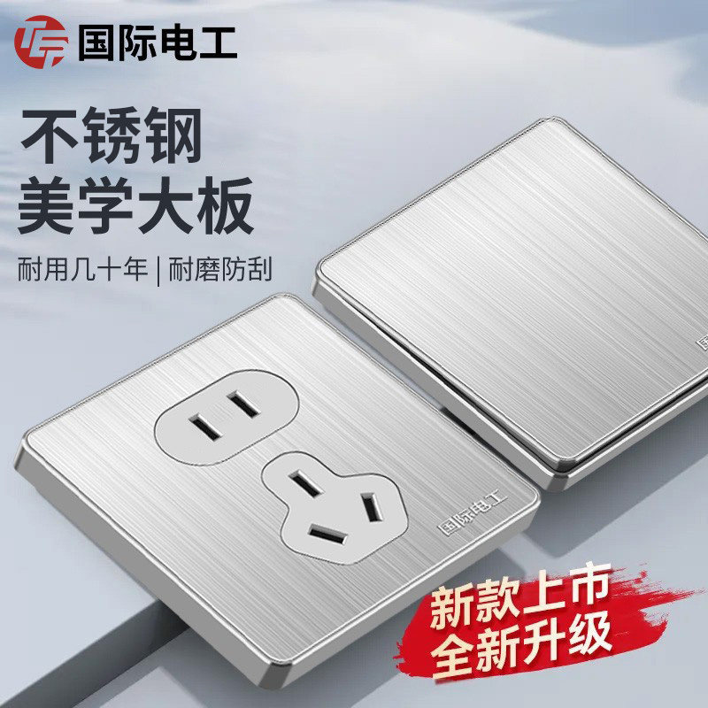 国际电工银色不锈钢电灯开关插座面板86多孔一开五孔墙壁家用16a