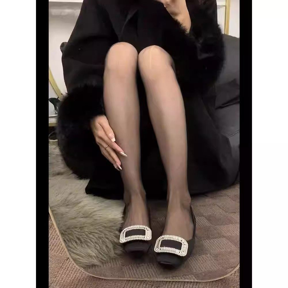水钻扣真丝中跟方头单鞋女2025春季新款黑色高跟宴会鞋rv高跟鞋女