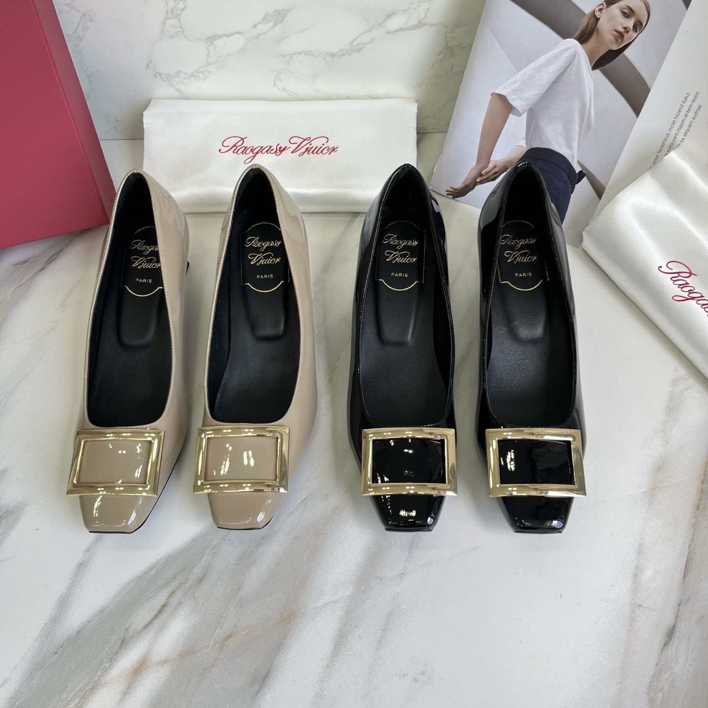 2025秋季新款 网红同款rv漆皮方扣单鞋 粗跟中跟方头浅口女鞋通勤