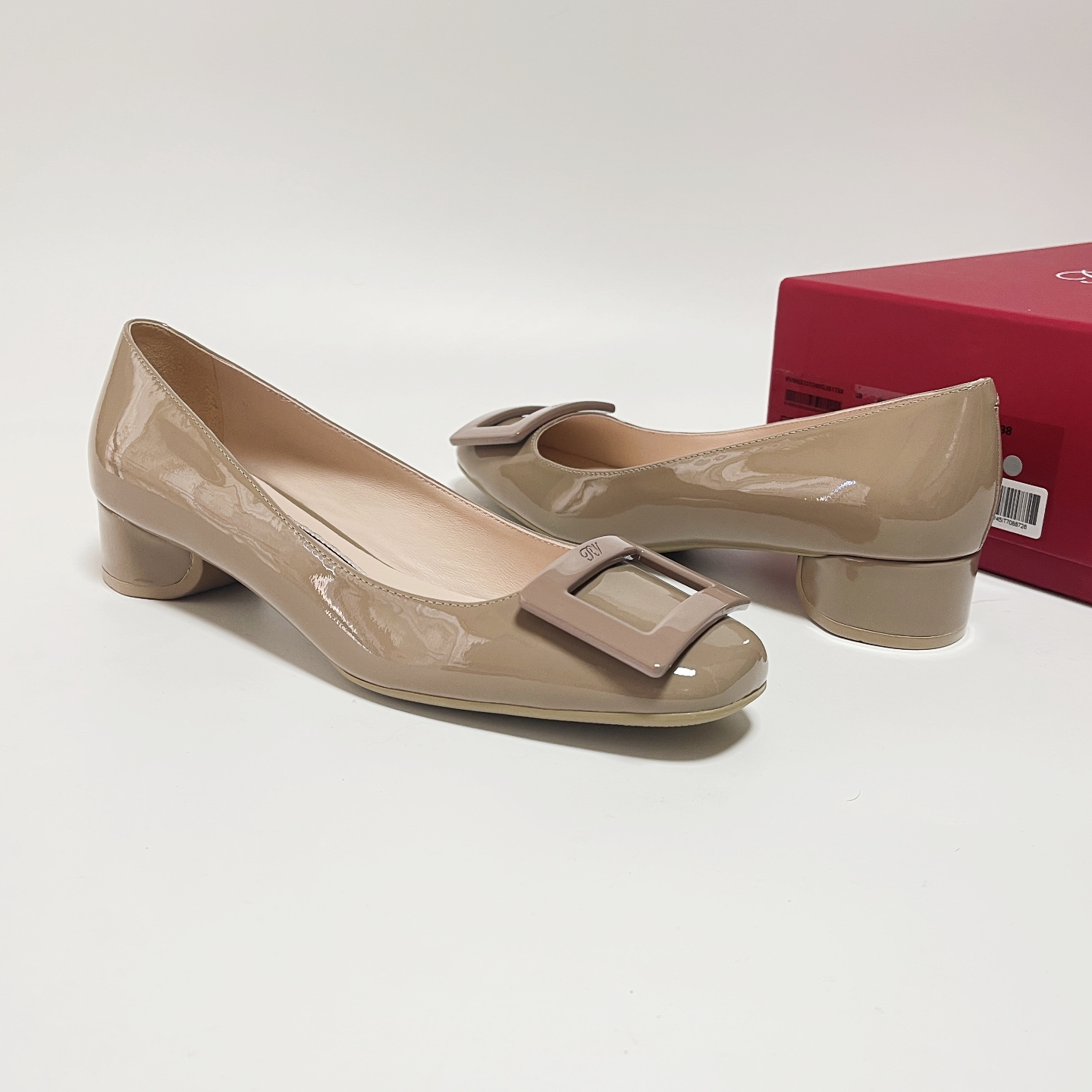2025夏季新款杏色rv浅口粗跟中跟金属方扣方头漆皮法式气质单鞋女